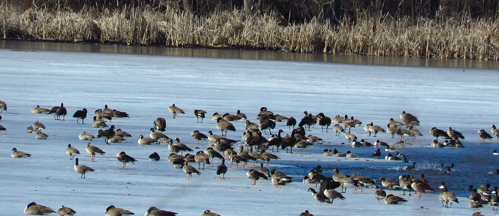 The week has been warm. Above freezing and Friday night to Saturday night there was a cold snap. Temperatures dropped a bit below freezing. Ice formed in hotspots that were fairly open water. I spent the day visiting places that were productive a couple of days ago, but frozen over this morning. Very slow day full of Canada Geese.